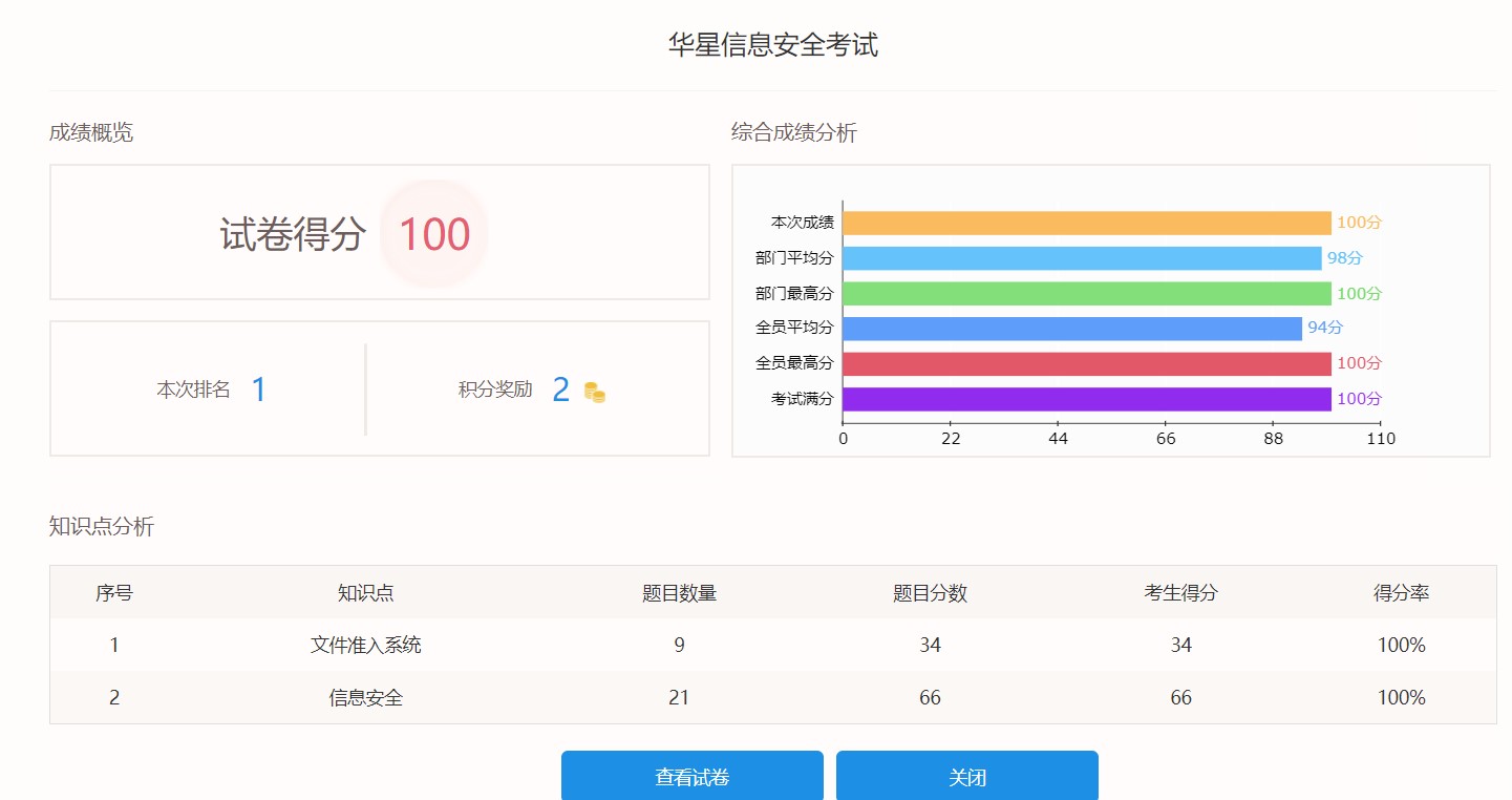 四是開展多輪信息安全考試、有獎(jiǎng)競(jìng)答活動(dòng),對(duì)全員進(jìn)行全覆蓋考核,及時(shí)檢驗(yàn)信息安全知識(shí)掌握情況,反饋活動(dòng)成效,確保人人熟知信息安全理論知識(shí),掌握技能技術(shù)。信息安全考試已有997人參加,考試合格率百分之百。
